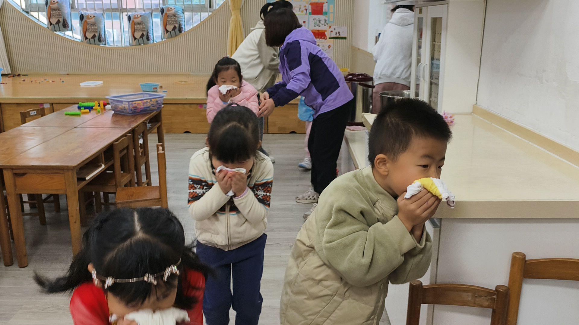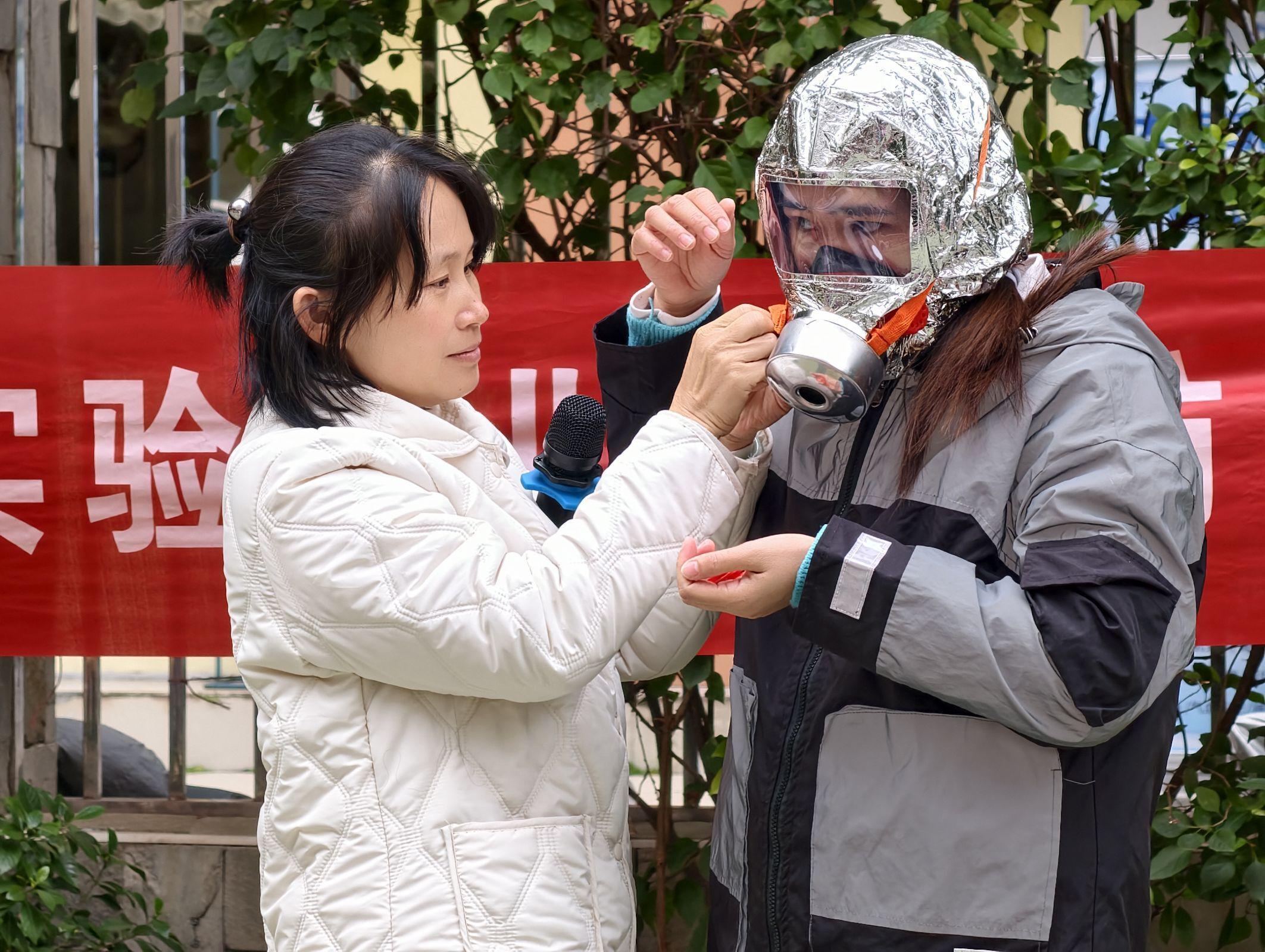 演练结束后,幼儿园同步开展复盘提升环节。余老师带领幼儿认识消防设备,并现场抽取教师示范过滤式消防自救呼吸器使用方法,随后组织幼儿在班级内轮流体验佩戴,让消防知识转化为实用技能。总指挥彭副园长、周老师分别总结三园区演练情况,既肯定师生无预警状态下的快速反应与有序逃生表现,也强调要以此次演练为契机,持续强化安全意识,筑牢生命安全防线。