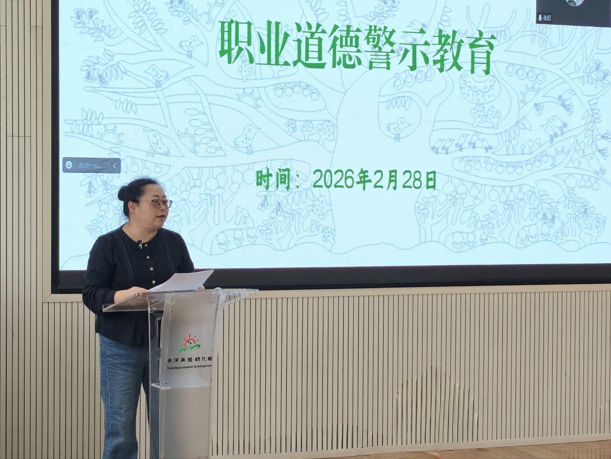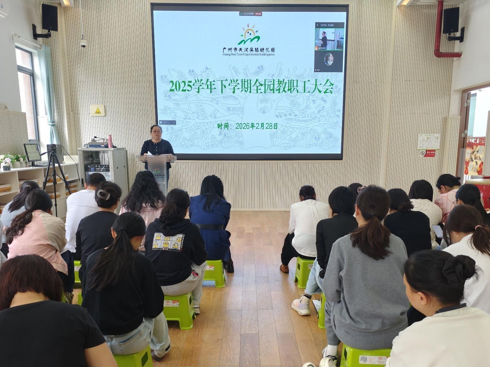 为统筹部署新学期工作,统一思想、凝聚合力,锚定生态课程与优质保教方向,2026年2月28日下午,潘卓园长以“凝心聚力启新程,实力担当促发展”为题,围绕师德师风、保教工作、后勤保障、党工妇团建设、校园安全五个方面召开新学期首次全园教职工大会,在职业道德警示教育中,潘卓园长结合教师违反职业道德行为典型案例的通报,深刻阐释幼教职业道德内涵与底线,引领全体教职工坚守为党育人、为国育才初心,恪守师德规范,以高尚情操与严谨态度践行幼教使命,守护童心成长。
