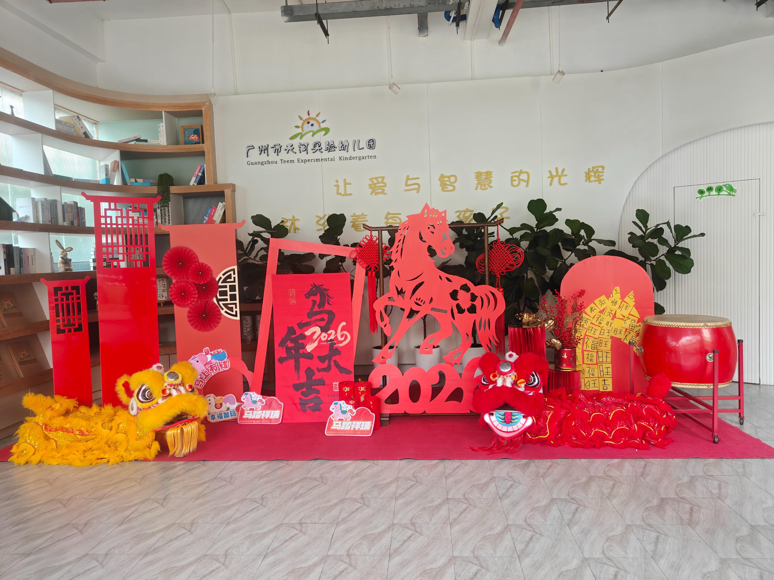 草长莺飞,春意萌动,幼儿园的自然角、游戏区、活动室处处涌动着温暖而忙碌的身影。老师们遵循生态育人理念,对教玩具、桌椅、户外器械、班级区域进行深度清洁、科学规整,让环境更安全、更适宜、更具探索性。园区融入马年新春元素,红彤彤的灯笼对联、童趣盎然的骏马挂饰、满载期许的新年愿望墙与自然生态景观相映成趣,一步一景皆藏匠心,让年味与绿意共生,为孩子们打造充满爱与生机的成长乐园。